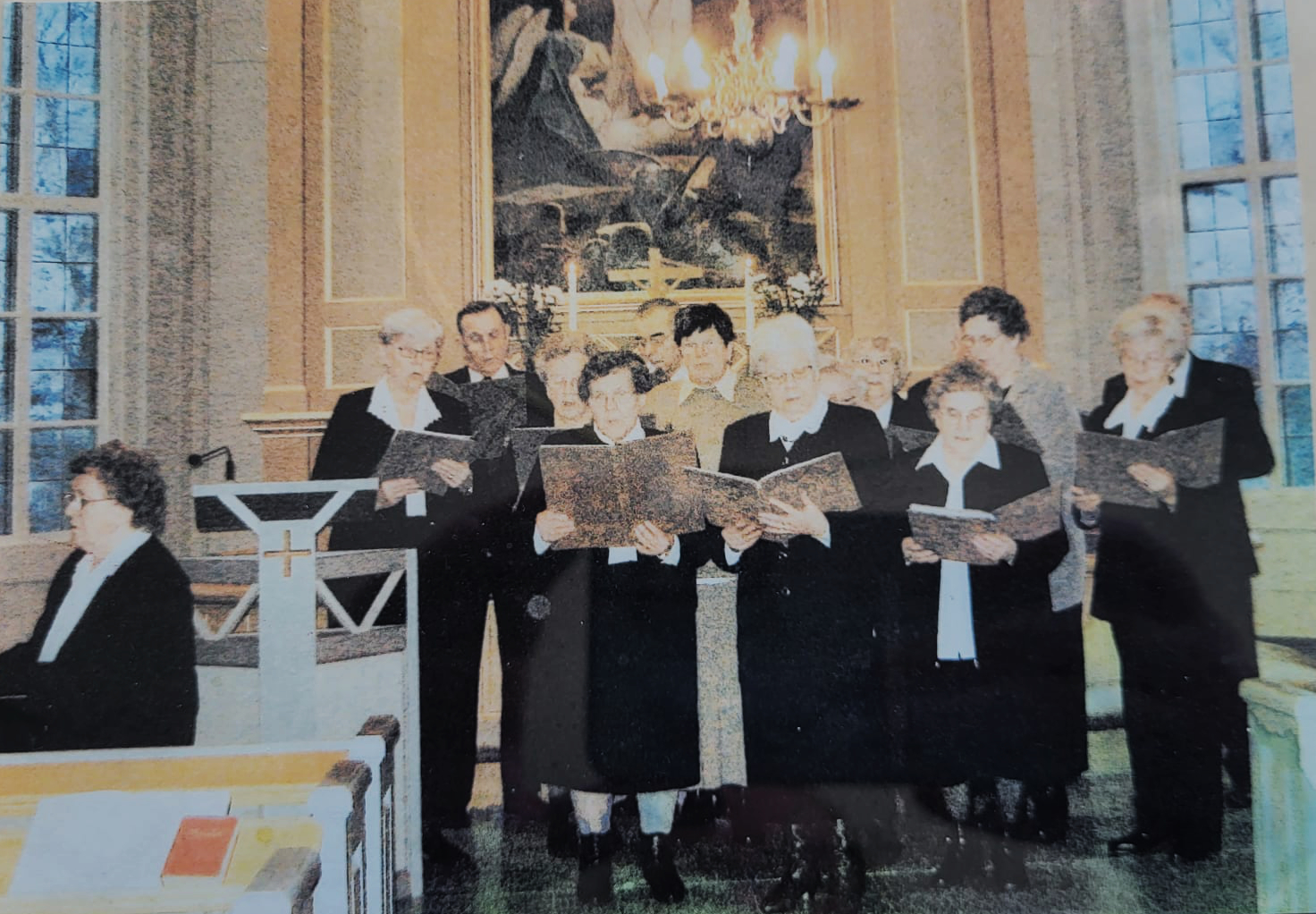 Sig-Britt Slotte (vid piano), Berit Hongell, Aurén Allan, Frida Plogman, Greta Simonsbacka, Helena Wiik, Ulla-Britt Storbacka, Olof Helminen, Gunnel Nyman (skymd), Anja Slotte, Ann-Lis Slotte, Anna Aurén, ev. Harald Brännkärr skymd.