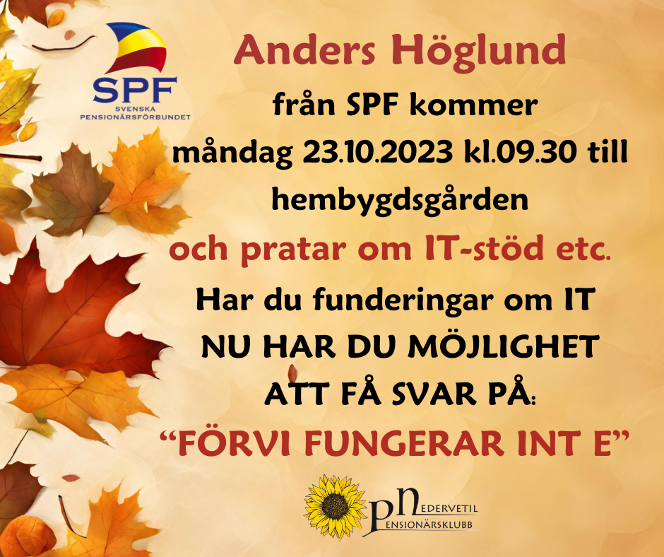 Nö har ni möjliheit ti kåma å ställ kvistiga frågor åt Anders Höglund ( han är ein helt vanlian Purmo bo) vi hembygdsgååle, byri skriv ner va ni sko vila veta så mitt i allt har han svare. Å har int ni na frågona så lägger vi han beret om IT-stöd, he rej kan ställ frågona