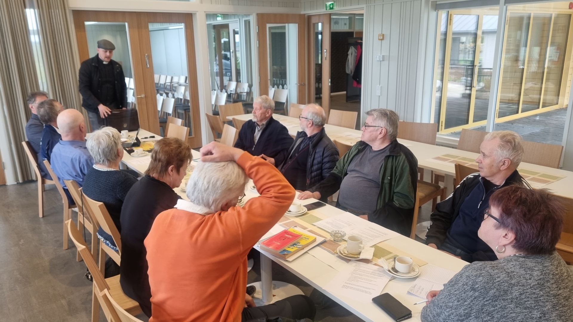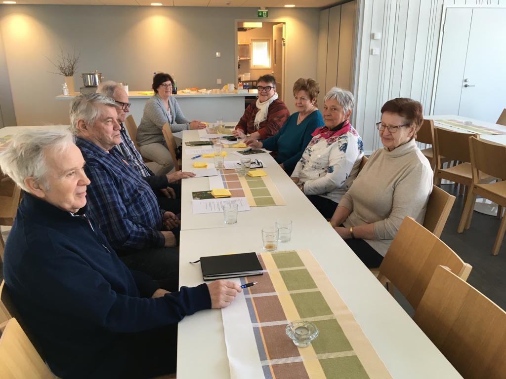 Deltagare från Kronoby, Nedervetil och Terjärv pensionärsföreningar samt Niklas Wallis från församlingen planerar projektet. Ein terjervboo er na liiti fundeersam, å skrapar se i hövå "he kåmber seekert allt fö mytji sjungara"!